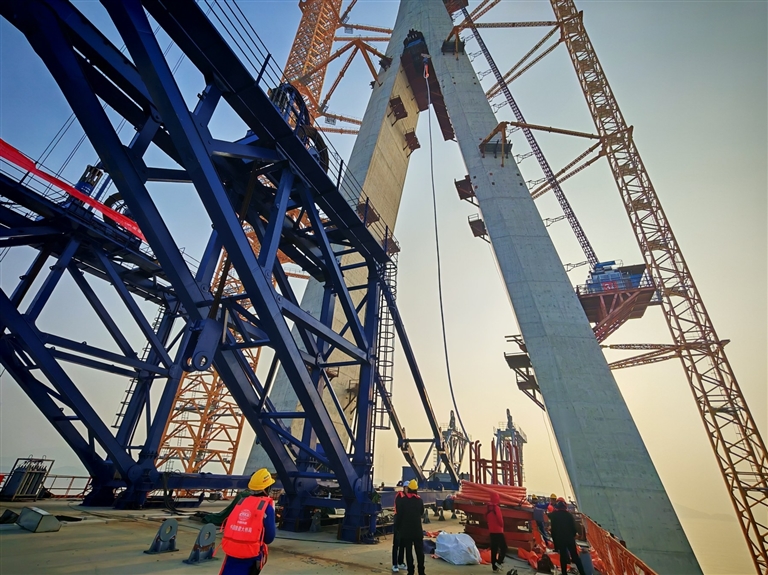 1月6日,随着最后一道锚固工序完成,六横公路大桥二期工程关键控制性工程——青龙门大桥首对斜拉索成功挂设,标志着这座世界最大跨度三塔钢箱梁斜拉桥正式从“立塔成型”阶段迈入“斜拉成桥”的核心施工阶段,为主桥钢箱梁按期合龙奠定坚实基础。