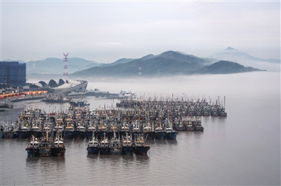 4月6日下午,从沈家门渔港高处眺望,海上雾气笼罩,远处的岛屿如浮云海,若隐若现。