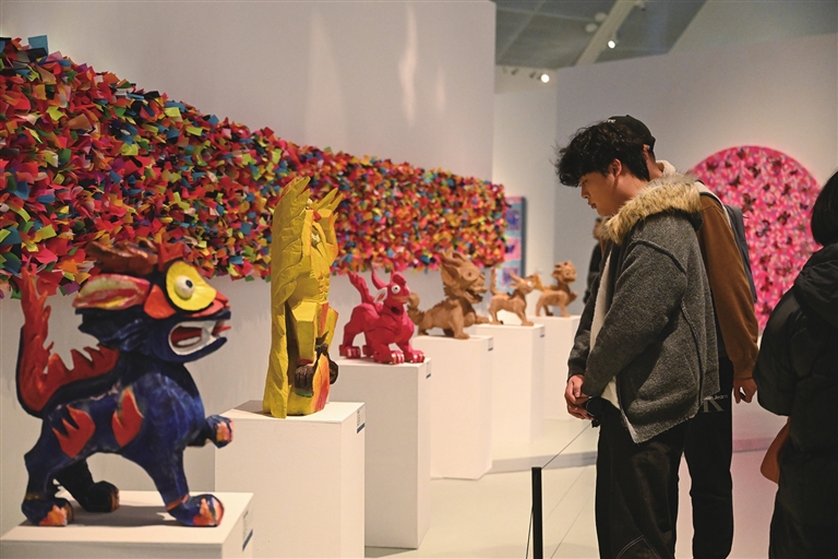 花彩海上——古原整体艺术作品展(舟山站)1月16日在普陀美术馆开幕。展出近百件装置、绘画及雕塑作品,其中特别运用舟山渔网创作的系列装置,蕴含丰收吉祥的寓意。展期持续至3月13日。