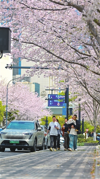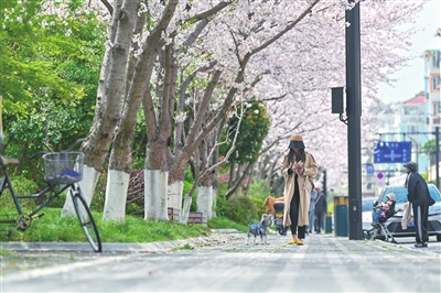 近日,东港海华路樱花盛放,粉白花瓣如云似雪。行人漫步花下,享受春日惬意。