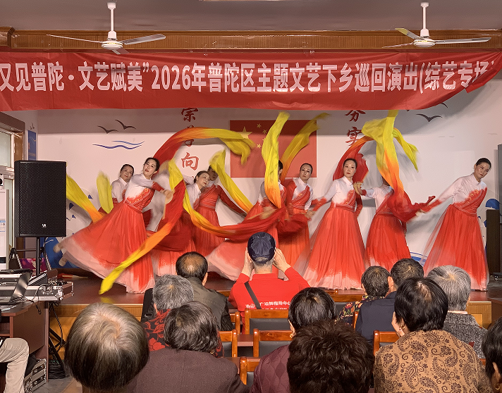 文化礼堂舞台上,身着红白渐变长裙的舞者们以灵动身姿翩然起舞,红黄相间的绸带随节奏翻飞舒展,如春日流霞般勾勒出昂扬向上的姿态。从活力歌舞到趣味小品,从非遗韵味到时代旋律,多元节目轮番登场,既饱含普陀渔家风情,又彰显着新时代海岛的蓬勃气象,让村民们在家门口享受到了一场接地气、有温度的文艺大餐。“外面下着雨,礼堂里却暖烘烘的,节目也好看,就像过年一样热闹!”前来观看演出的村民笑着说道。